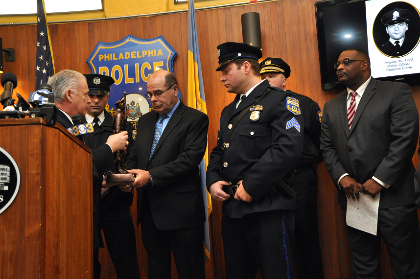 The posting of the $10,000 Safe Cop reward was predicated upon a request from Philadelphia Police Deputy Commissioner Nola Joyce on August 8, 2013. This crime is the only unsolved murder of a Police Officer in the history of the Philadelphia Police Department. Our family of one deserves closure, indeed case closed by the arrest(s) of his murderers if still alive. A plaque at 17th and Oxford marks the spot where Officer Cione was shot and killed, a reminder of how vulnerable members of law enforcement are and that we are one family that never forgets our own.