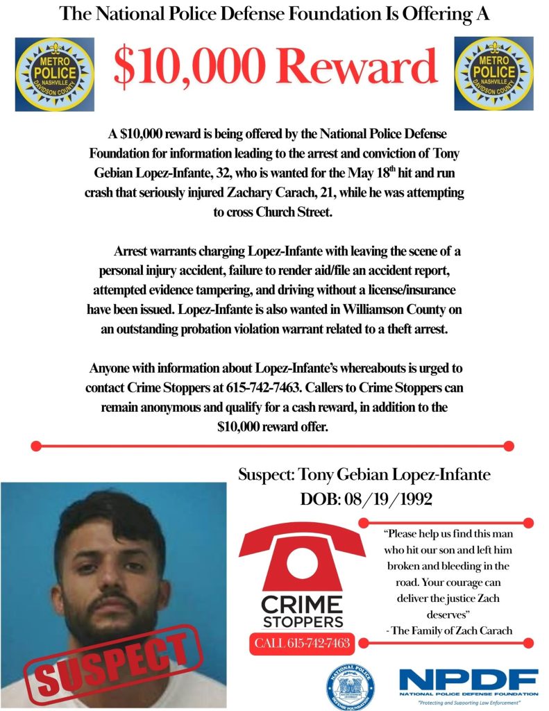 The National Police Defense Foundation is working in conjunction with the Department of Homeland Security and Nashville Police Department to bring this fugitive to justice by offering a $10,000 reward for information leading to the arrest and conviction of Tony Gebian Lopez Infante (aka Tony Lopez) for Assault by Auto and Leaving the Scene of an accident by calling the designated Safe Cop hot-line at 888-SAFE COP (888-723-3267). The National Police Defense Foundation is an IRS designated 501 (c) (3) non-profit organization under registration number 13-3830191. Please support the NPDF’s Safe Cop Program with your fully tax-deductible donations.
